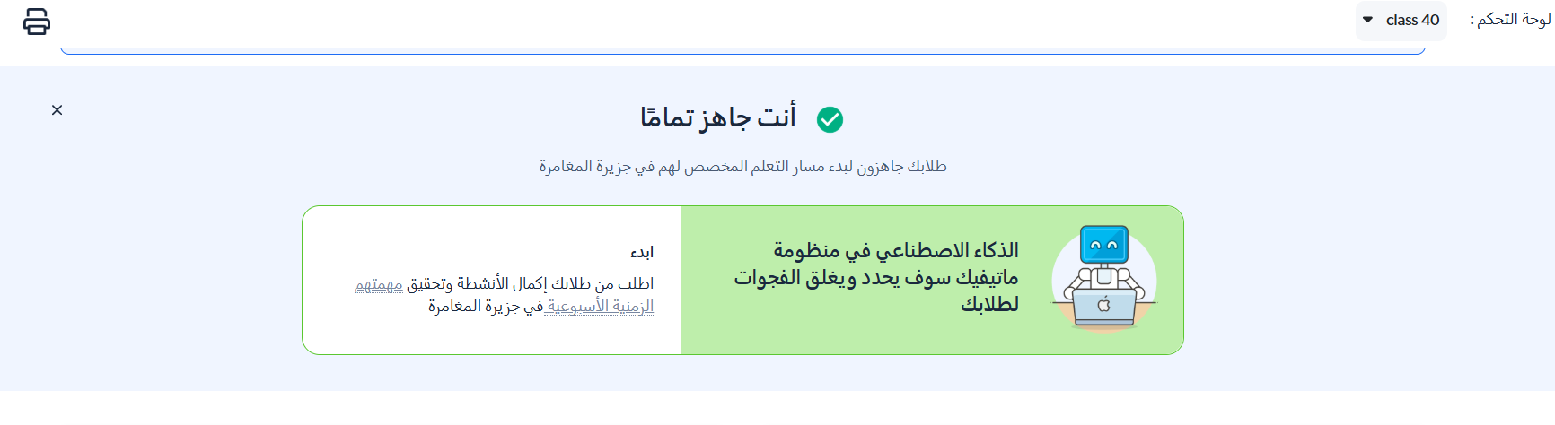 إذا كنت مستخدمًا جديدًا أو لم تنته بعد من إنشاء صفٍّ تعليميّ، فستساعدك لوحة التحكم في إكمال ذلك باستخدام بطاقة التأهيل الخاصة.