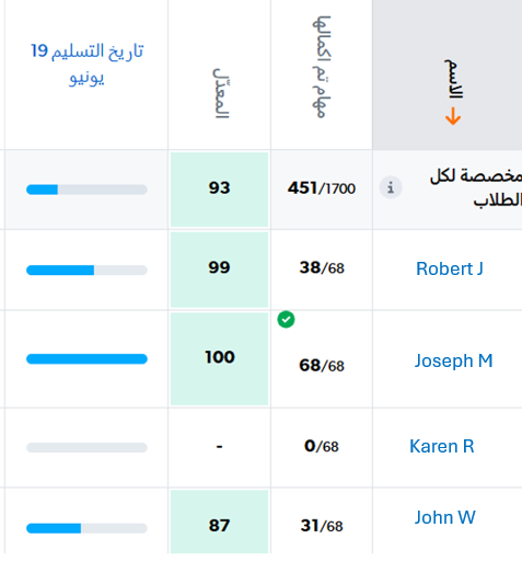 تمنحك تقرار المهام المخصصة نظرة سريعة جدًا على كيفية أداء الطلاب للمهام المخصصة لهم. يمكنك النقر على المجموعات الثلاث لمعرفة من أكمل العمل، من منهم ما زال يعمل ومن منهم لم يبدأ بعد.