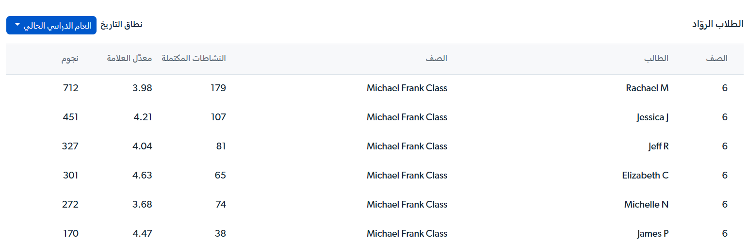 بطاقة الروّاد المدرسية (قائمة الصدارة) هي ملخص لصفحة المتصدّرين التي يمكن الوصول إليها الآن في قسم التقارير في ماتيفيك. يجد العديد من المعلمين فائدةً في معرفة طلاب الصف الذين حصلوا على أكبر عدد من "النجوم" في حساباتهم. عرض النجوم هو مزيج جيد من الأنشطة المكتملة ومعدّل الأداء.