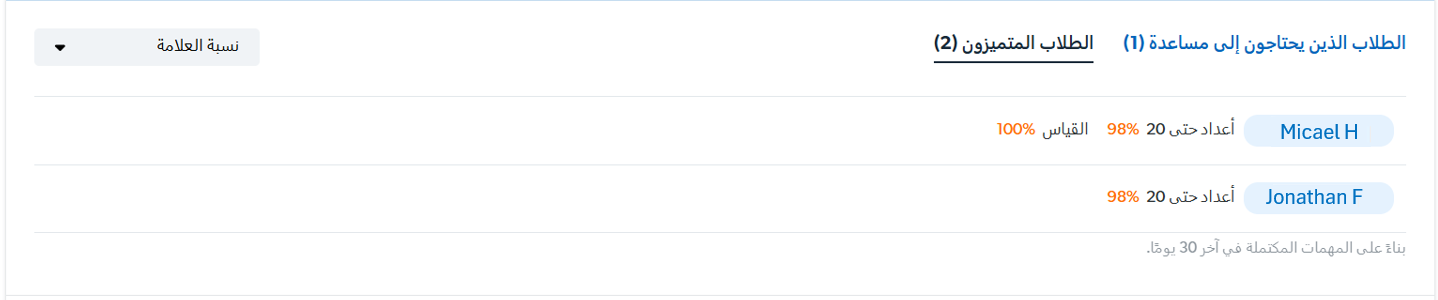 بطاقة الطلاب الذين يحتاجون إلى المساعدة، أو الطلاب المتفوقين، تعتبر وسيلةً رائعة وسريعة لمعرفة من هم الطلاب المحتاجون إلى مساعدة ومن هم الذين عليك تقديم مزيد من التحديات لهم. ستظهر أسماء الطلاب على البطاقة إذا كان معدل علاماتهم في الموضوع أقل من 40٪ خلال الأسبوعين الماضيين. قمنا بتقييد الإطار الزمني بحيث تمنحك هذه البطاقة المعلومات الأكثر أهمية التي يمكنك العمل بناءً عليها. إذا كان الطالب قد وجد صعوبةً في السابق في أحد الموضوعات ولكنه الآن تقدَّم في الأداء، فلا نريد الخلط بين هذا الإنجاز الرائع مع الطلاب الآخرين الذين لا يزالون بحاجة إلى مساعدتك.