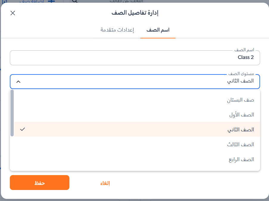 ."يمكن تغيير مستوى الصف التعليمي من خلال "مستوى الصف" عند الانتهاء يجب الضغط على "حفظ