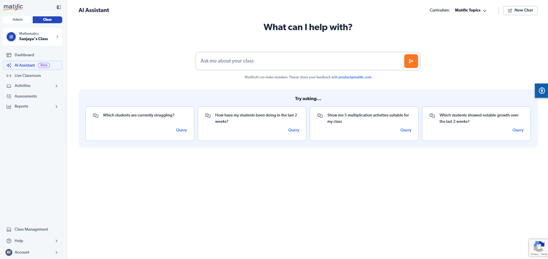 El Asistente de IA te ayuda a explorar perspectivas y obtener orientación relacionada con tu clase y los datos de los estudiantes.