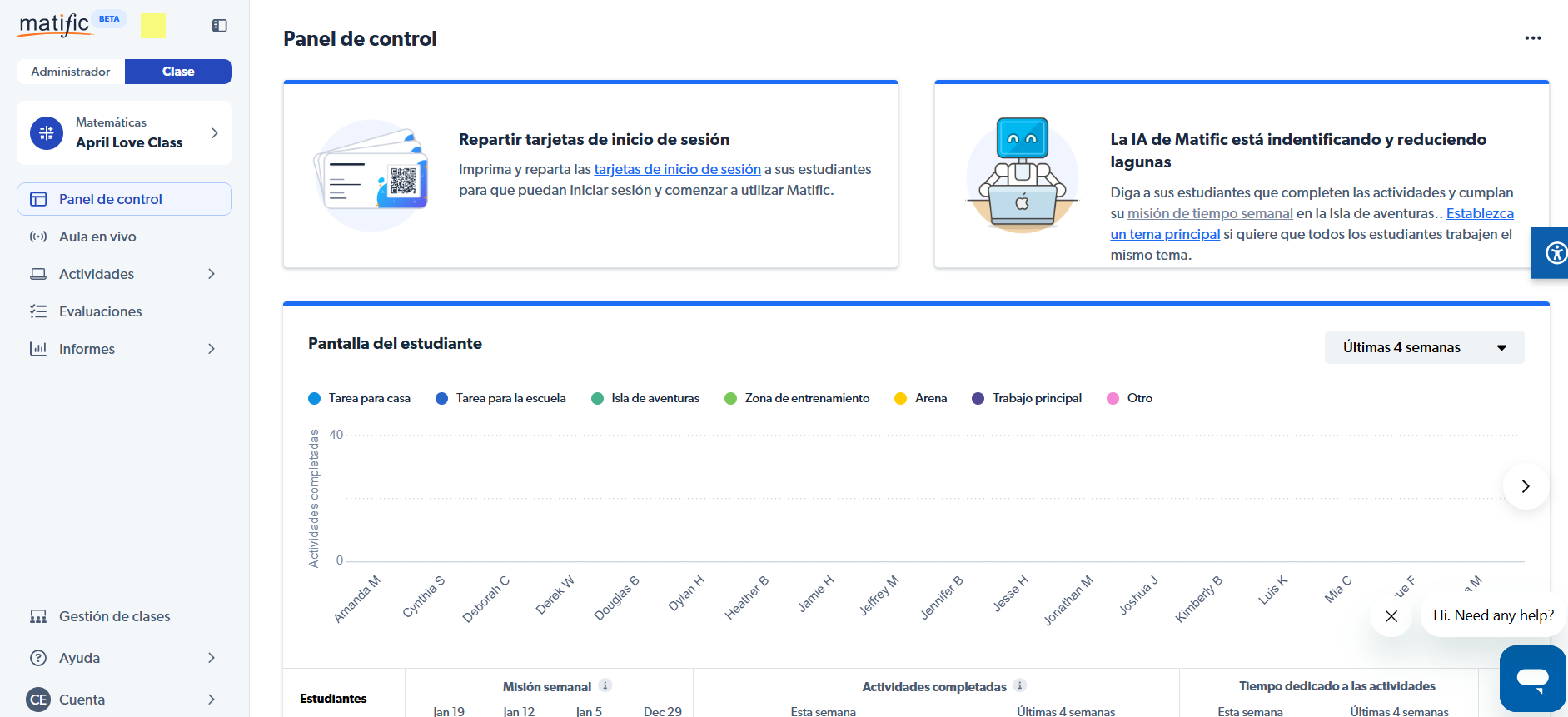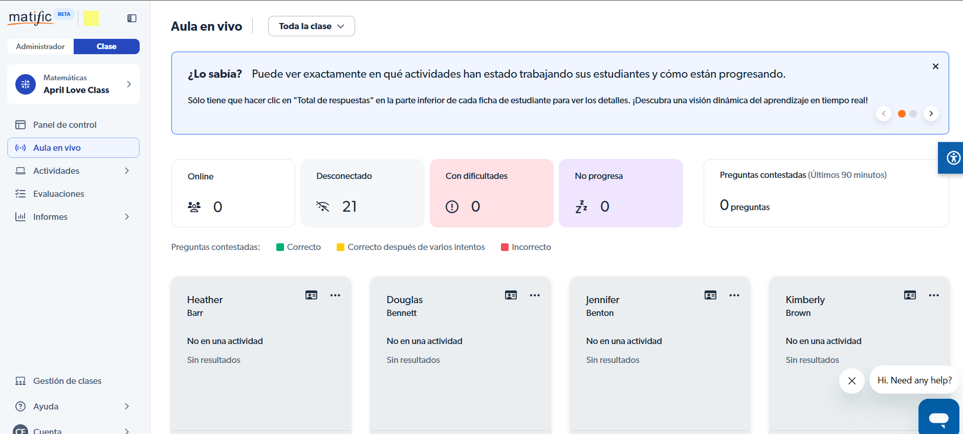 La Aula en Vivo te permite monitorear lo que tus estudiantes están haciendo en este momento.