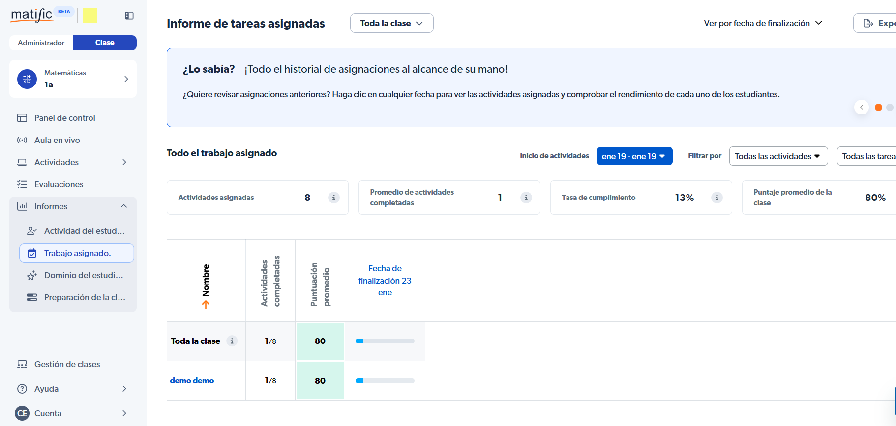 💡Este informe está disponible tanto para Matemáticas como para Educación Financiera y es especialmente útil para el seguimiento y la responsabilidad en el aula.