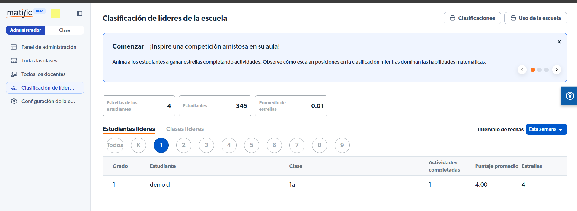 La Clasificación Escolar muestra cómo se comparan la actividad y el compromiso entre las clases dentro de una escuela.