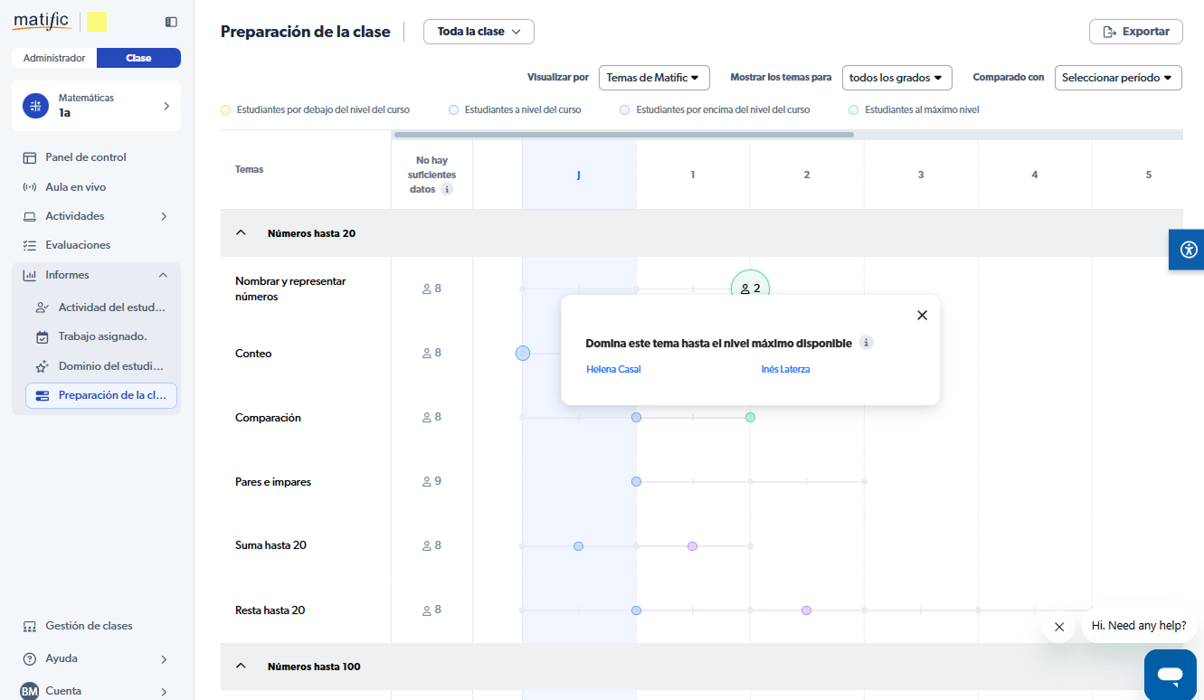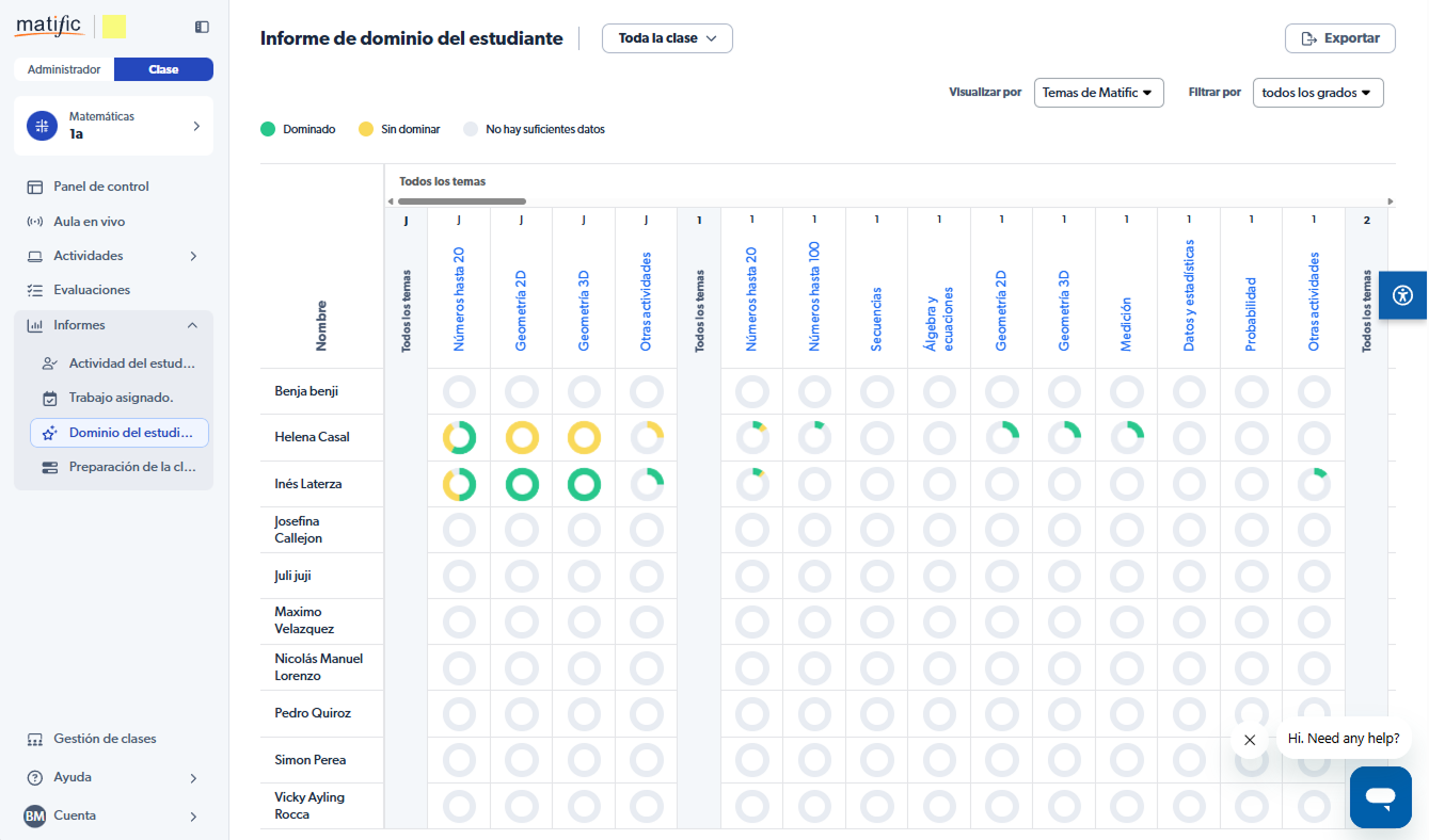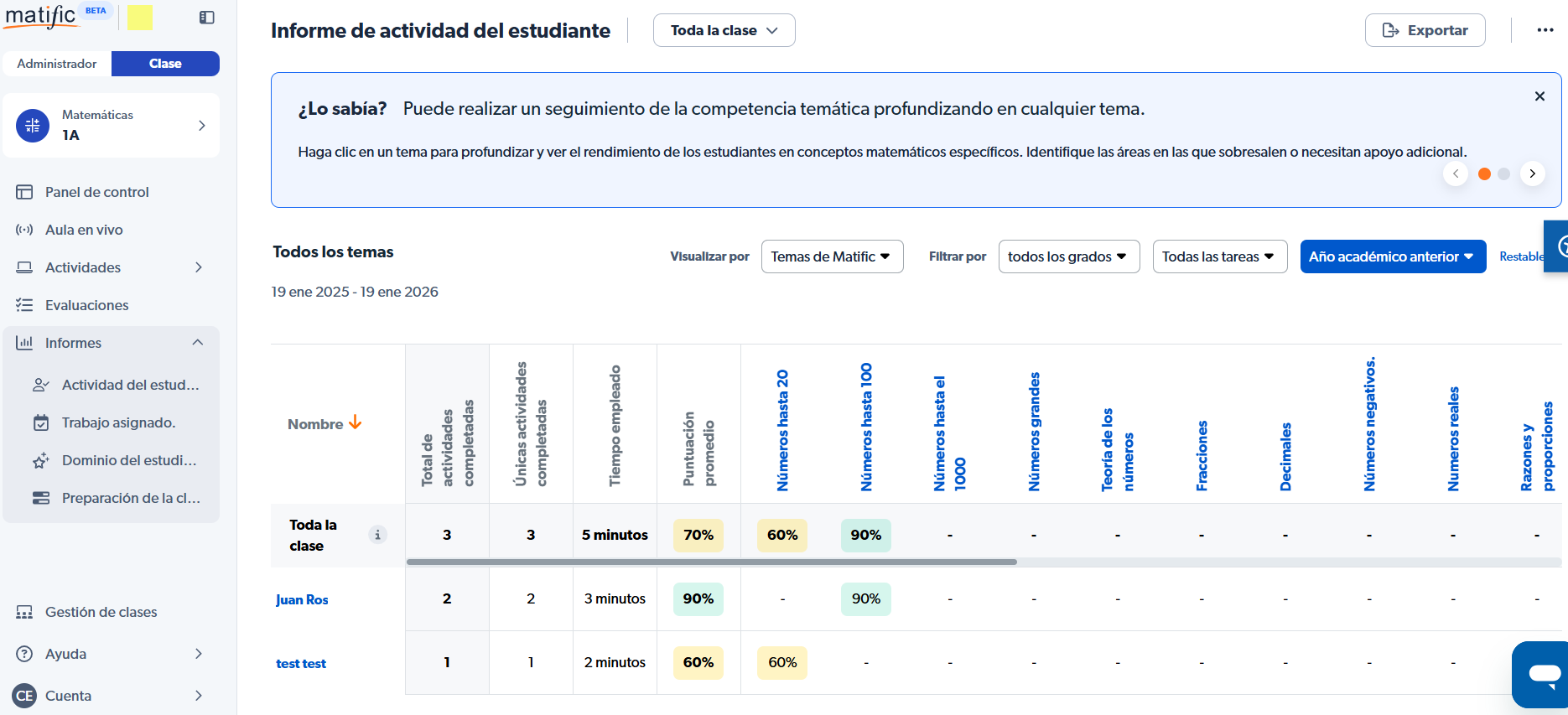 💡Este informe está disponible para Matemáticas, donde se rastrea el dominio de los temas a través de rutas de aprendizaje estructuradas.