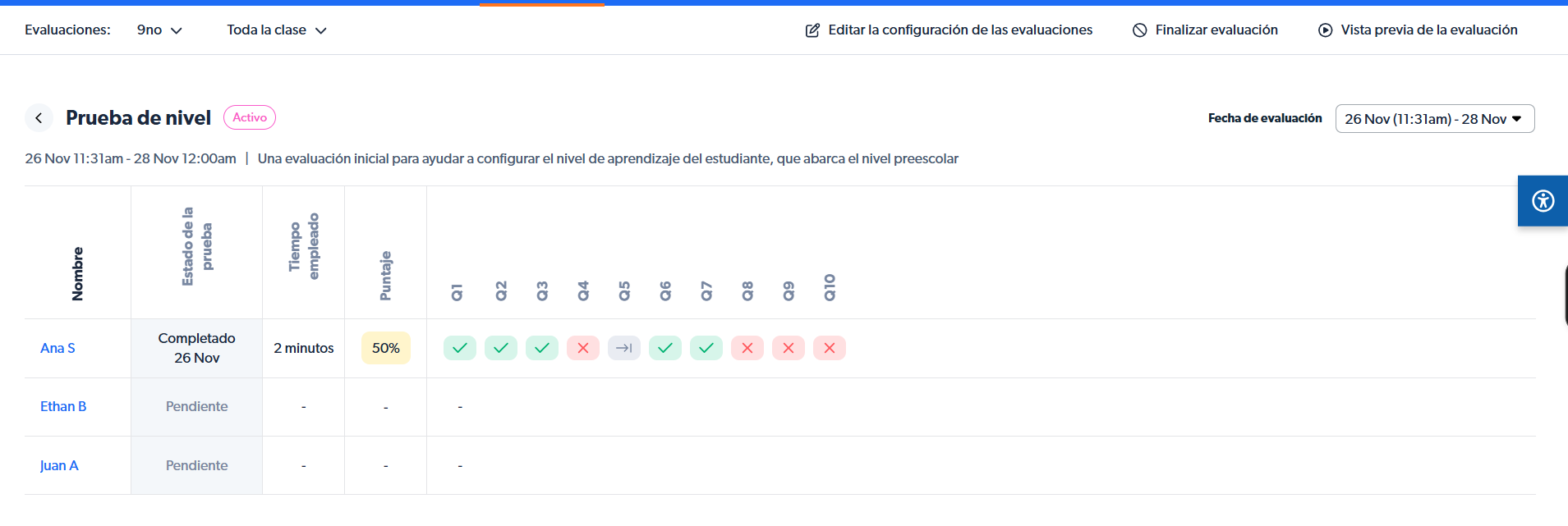 Desde la página de Evaluaciones, expande una evaluación activa para ver el progreso de la clase de un vistazo.