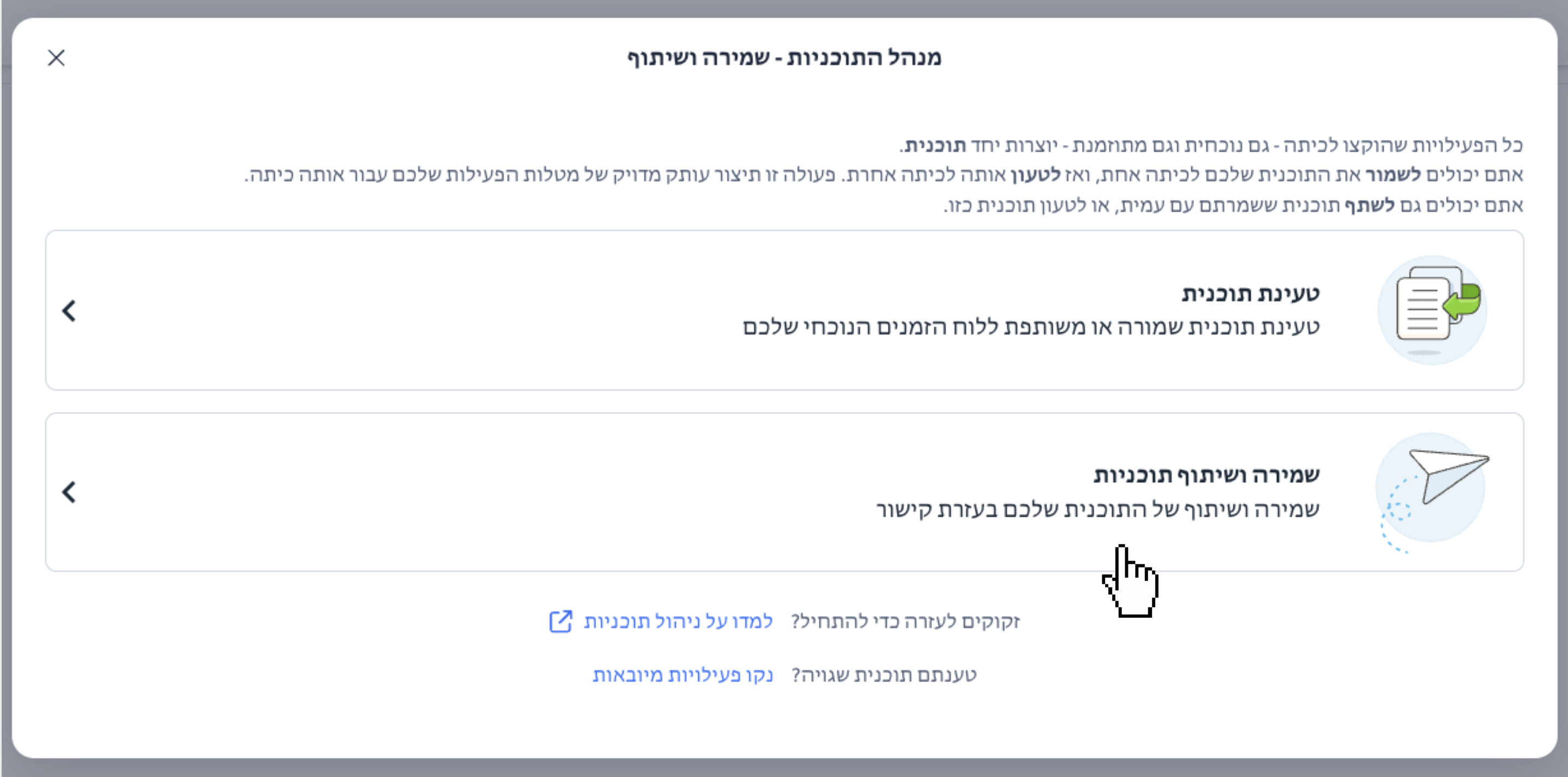 לחצו על מנהל התוכניות, ולאחר מכן בחרו שמירה ושיתוף תוכניות.