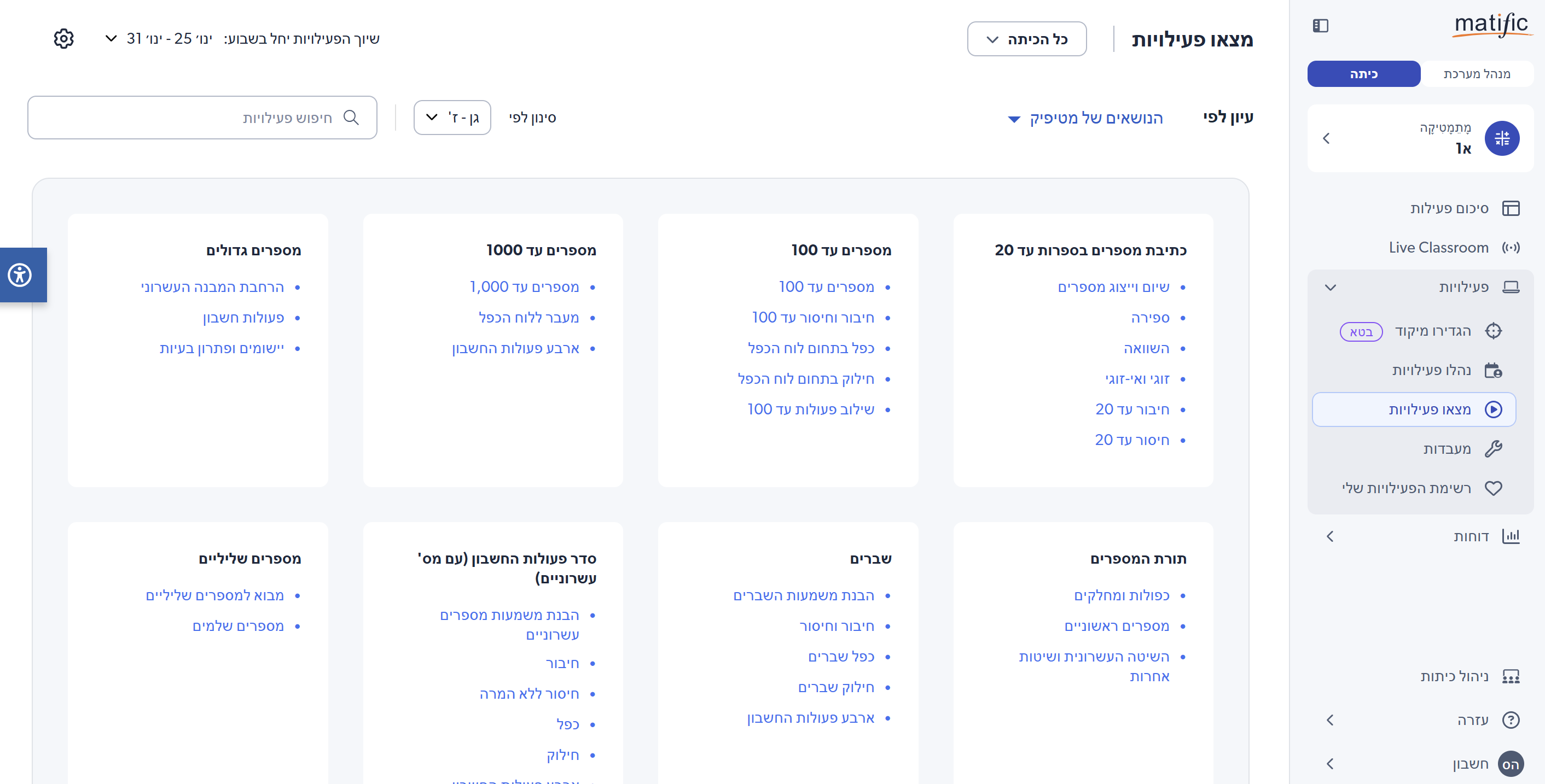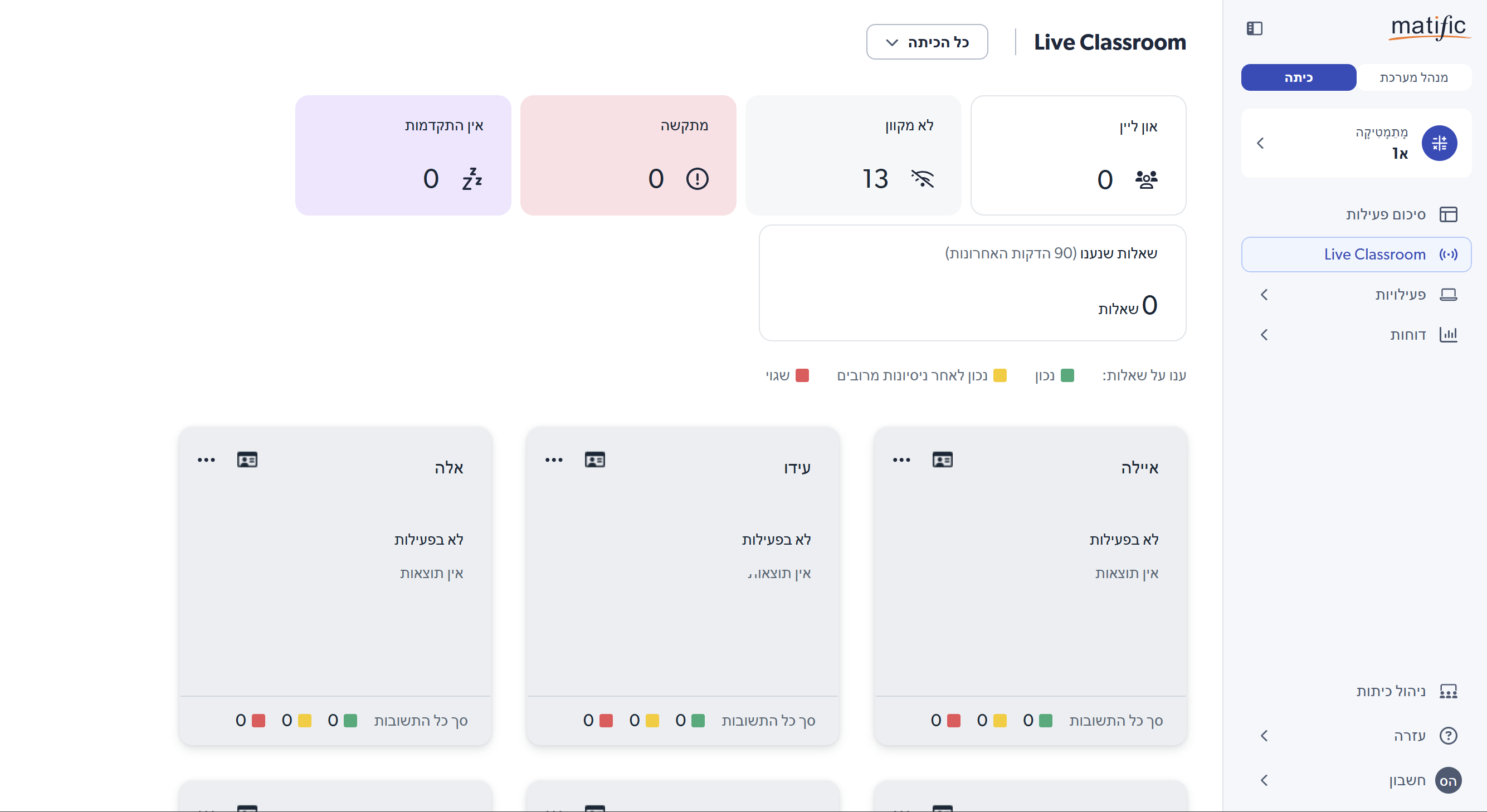 אזור זה משמש בעיקר להגדרה ועדכון כיתות, ולא לפעילות הוראה יומיומית.