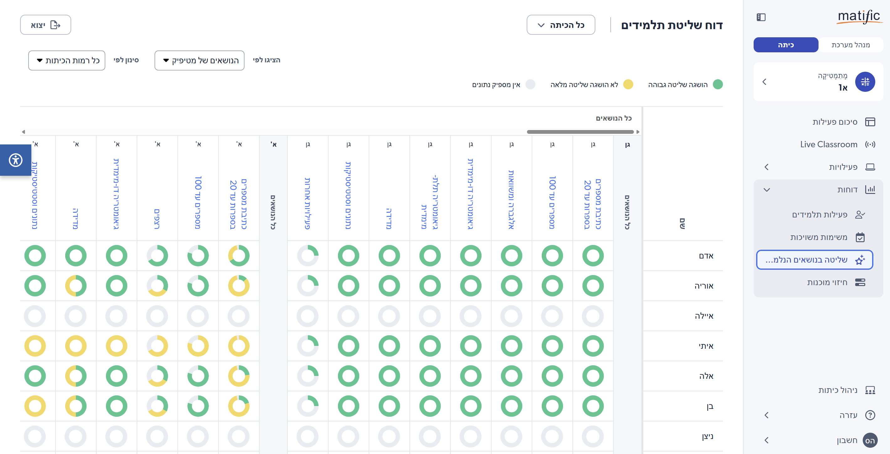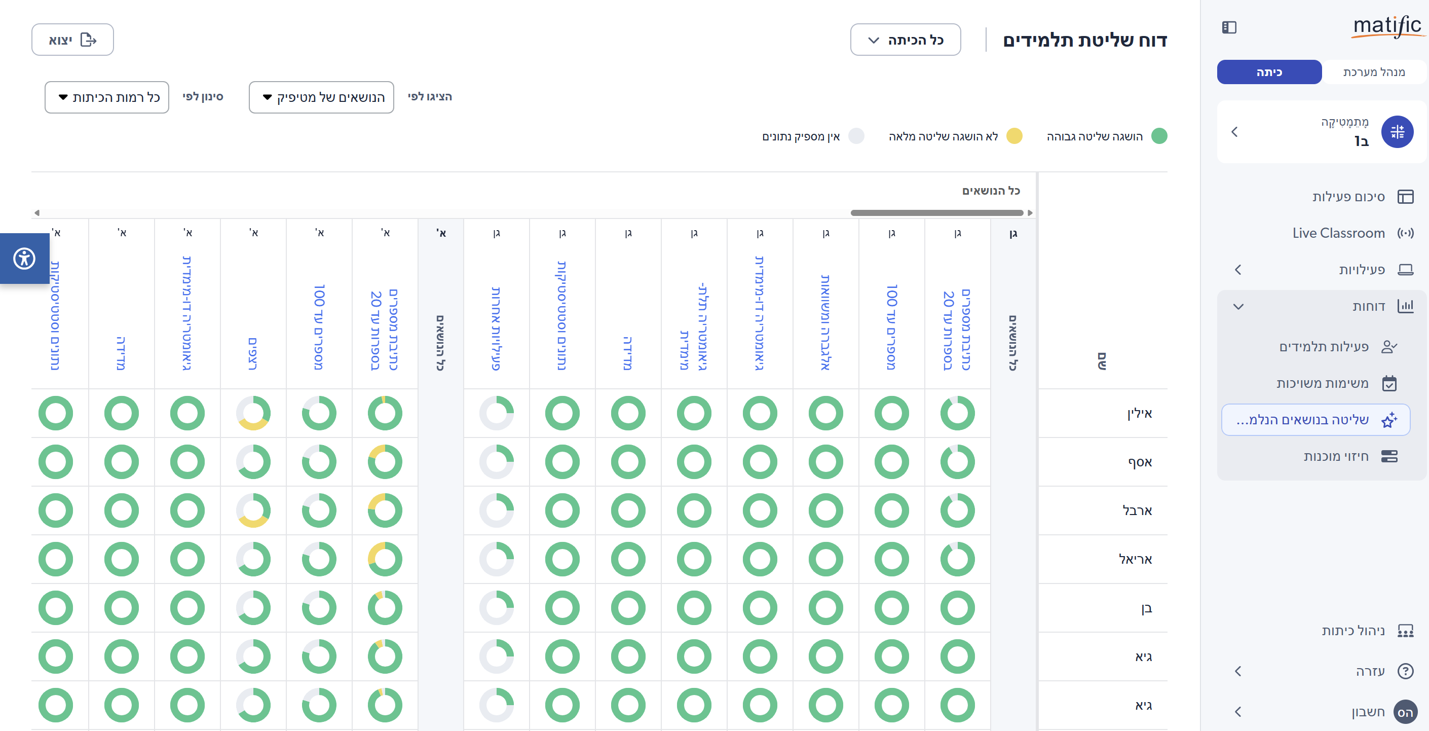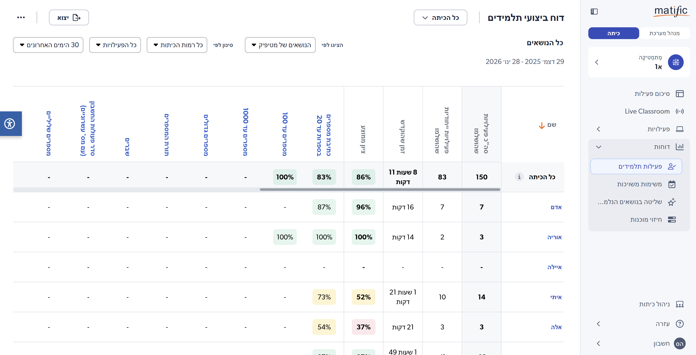אזור הדוחות מאפשר להתעמק ולראות כיצד התלמידים מתפקדים, באילו נושאים הם מצטיינים או זקוקים לתמיכה נוספת.