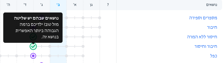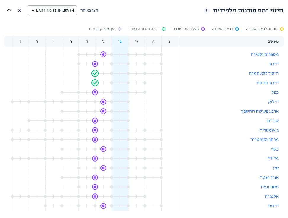 דוח זה חוזה את המוכנות של ילדכם לרמת הלמידה של השכבה בה הוא נמצא. התחזיות מבוססות על הפעילויות שהושלמו בנושא ספציפי ובתחומים קשורים נוספים.