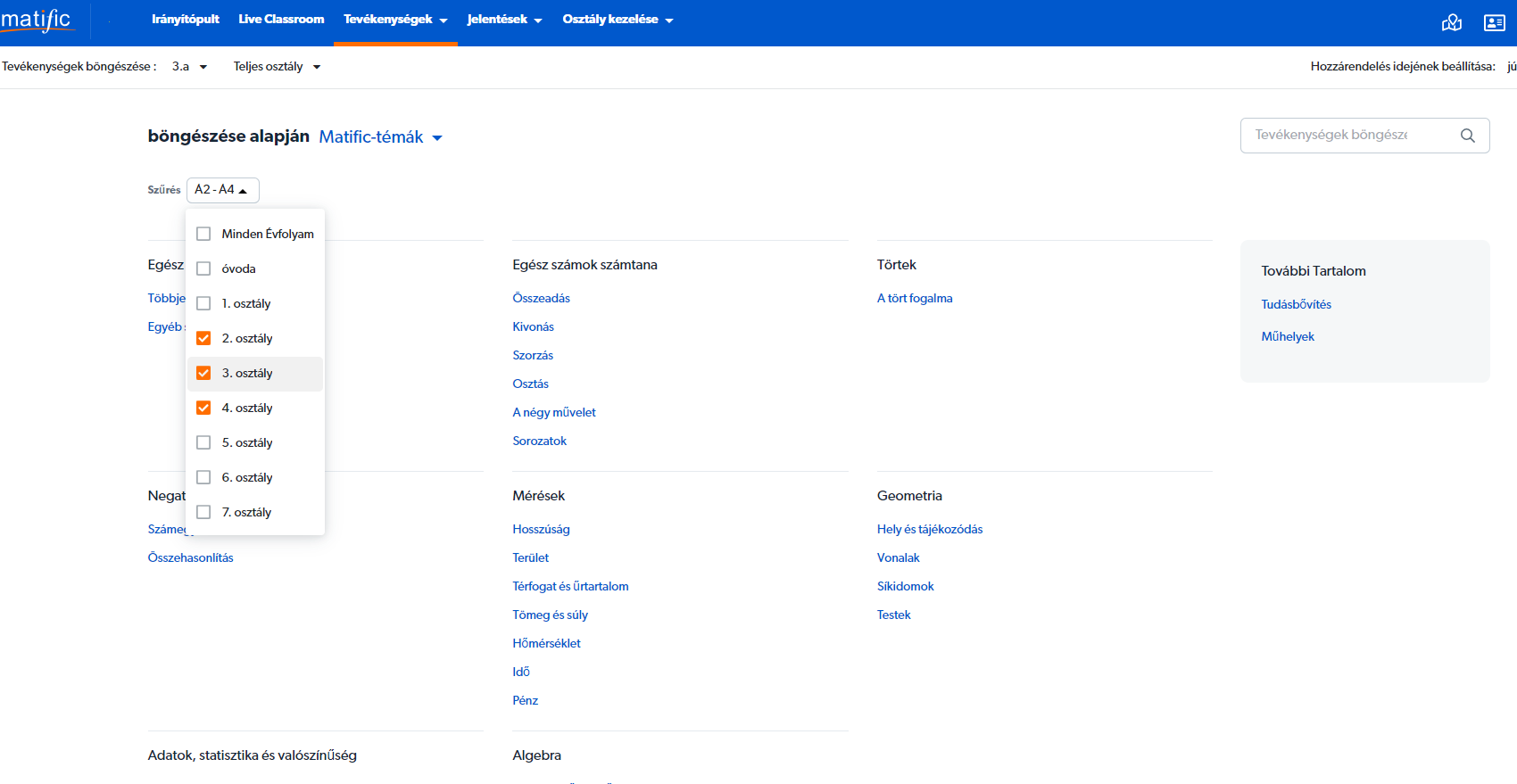 Kattintsunk az "Szűrés" melletti legördülő menüre: innen tudjuk módosítani, hogy milyen évfolyamoknak megfelelő feladatok közül szeretnénk válogatni. Kiválaszthatunk egy vagy több évfolyamot is.