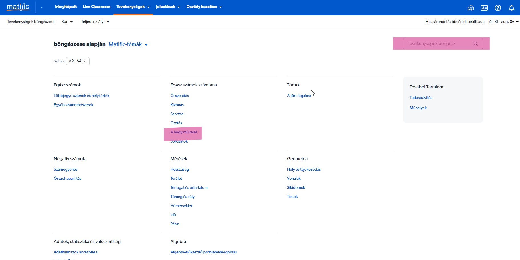 Bármelyik opciót is választjuk, a továbbiakban a megjelenő témakörök neveire kattintva juthatunk el az egyes feladatokig, vagy a jobb felső részen kulcsszó alapján tudunk feladatokat keresni:
