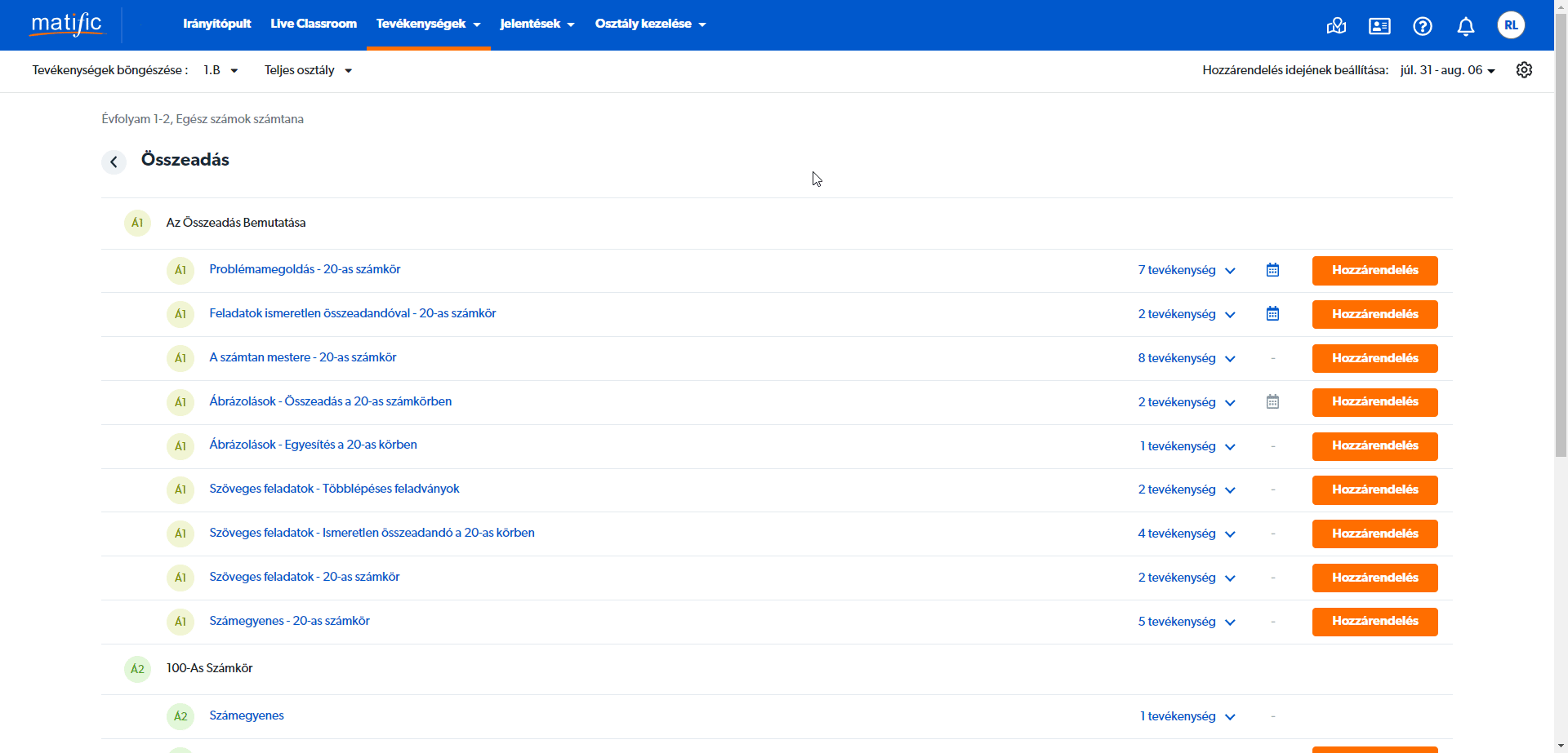 Végül az egyes feladatok szintjén a Hozzárendelés-re kattintva oszthatjuk ki az egyes feladatot a korábban beállított tanulónak, tanulóknak. (Ha a teljes témakör melletti Hozzárendelés gombra kattintunk, akkor a témakör összes feladata kiosztásra kerül a tanulóinknak.)