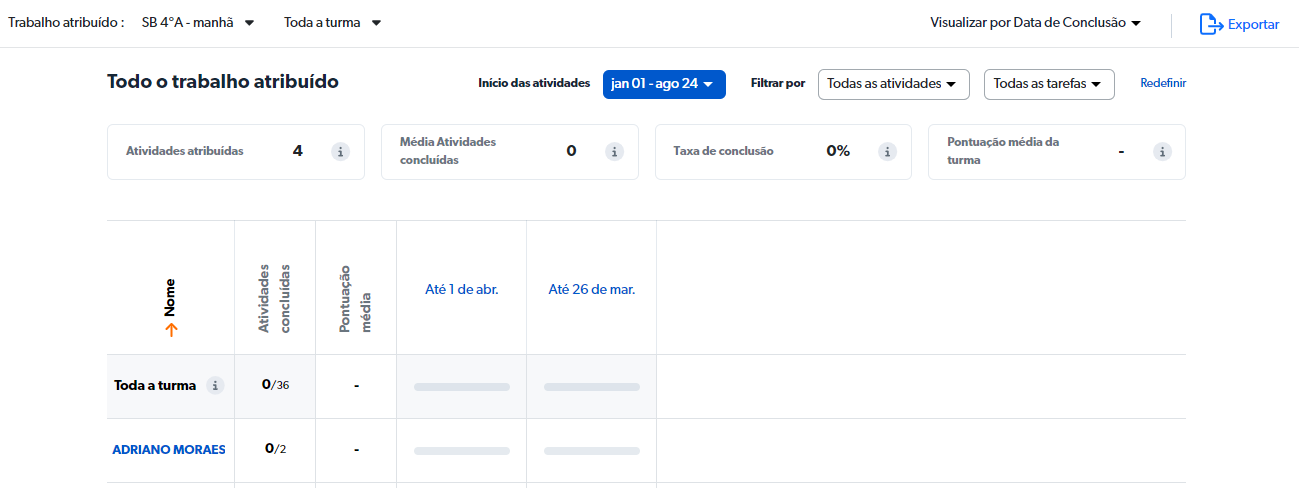 • Verifique quais alunos concluíram suas atividades atribuídas, estão trabalhando nelas no momento e ainda não começaram.