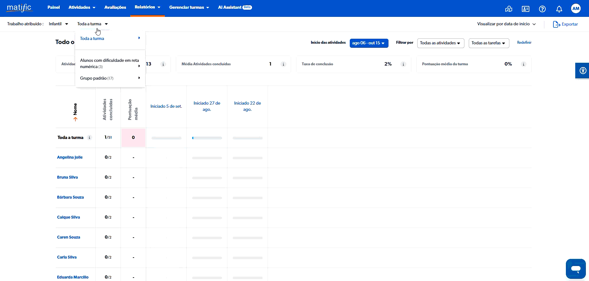 2. Selecione uma turma > Selecione a turma inteira ou um aluno.