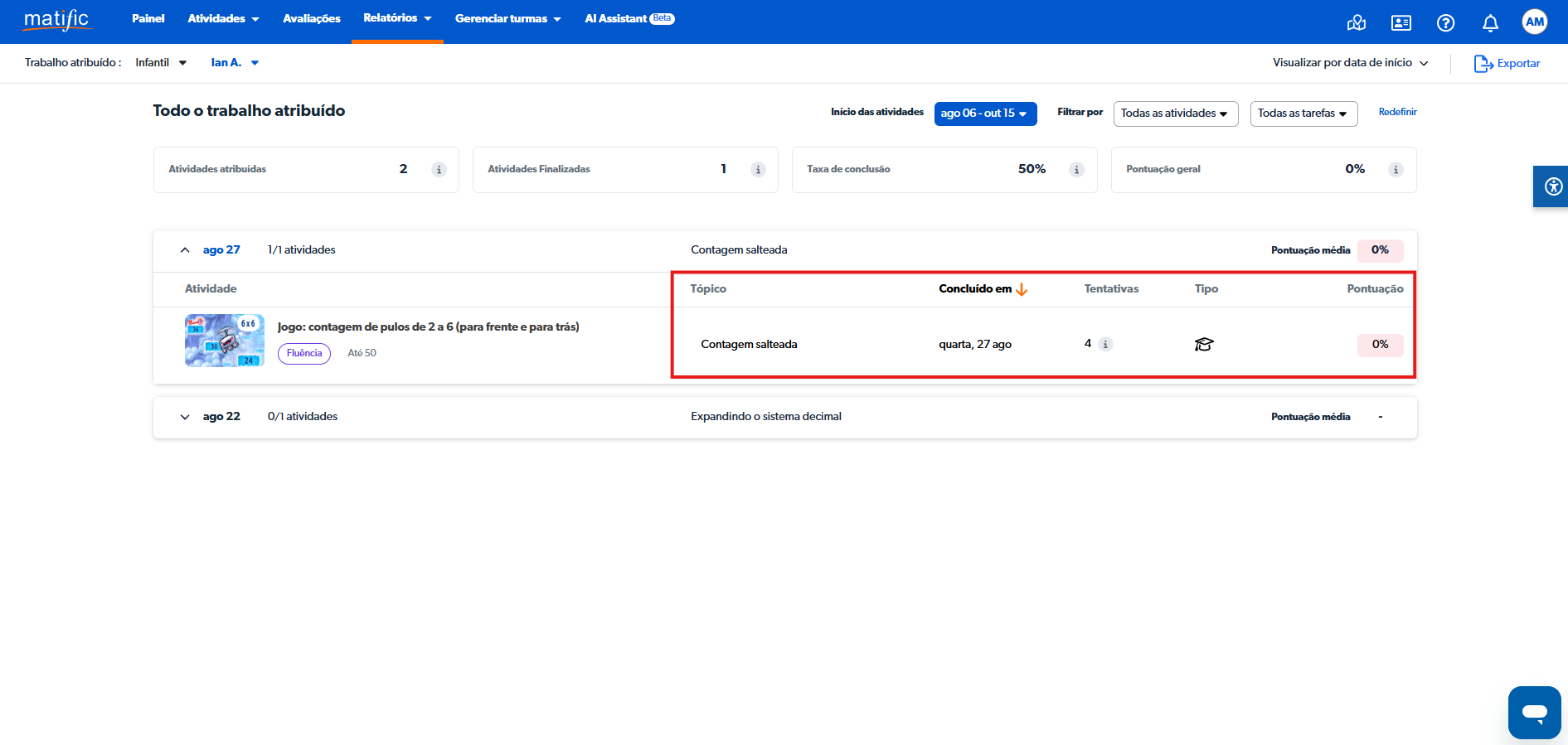 3. Você também pode selecionar um aluno para ver informações detalhadas: atividade, tópico, data de conclusão, número de tentativas, tipo de trabalho e pontuação.