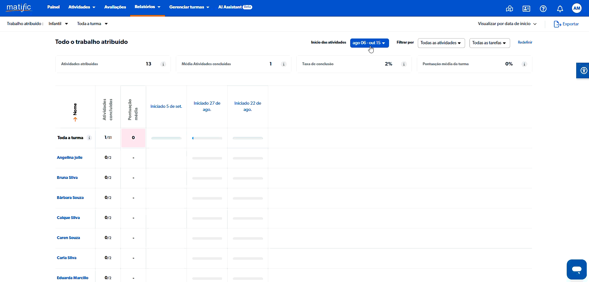 1. Você pode ver os detalhes da turma e de cada aluno no relatório.