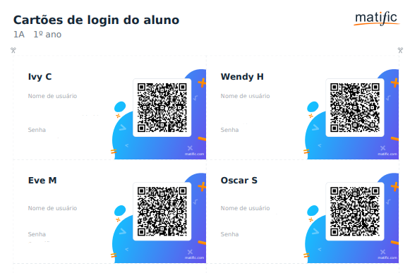 Os Cartões de Login dos alunos da sua turma, que contêm o nome de usuário, senha e código QR, serão abertos como um PDF em uma nova guia. As credenciais foram ocultadas para confidencialidade nesta imagem.