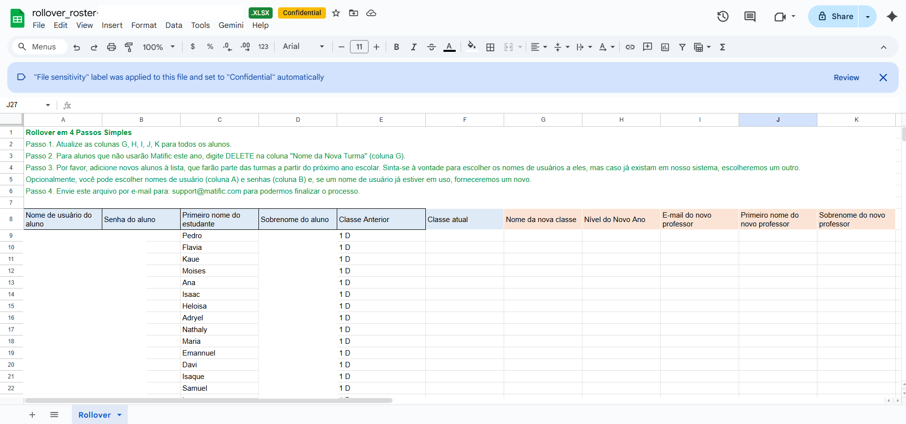 - Para alunos que não usarão Matific este ano, digite DELETE na coluna "Nome da Nova Turma" (coluna G).