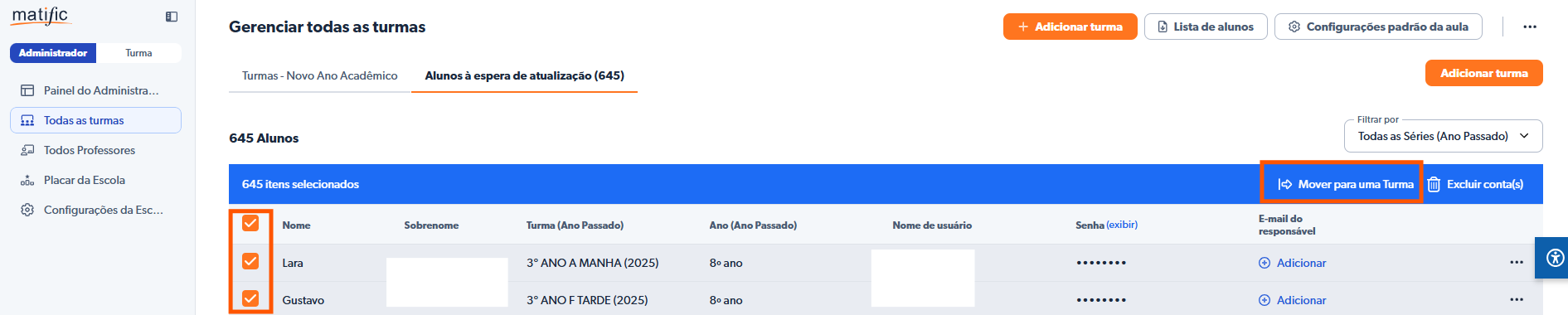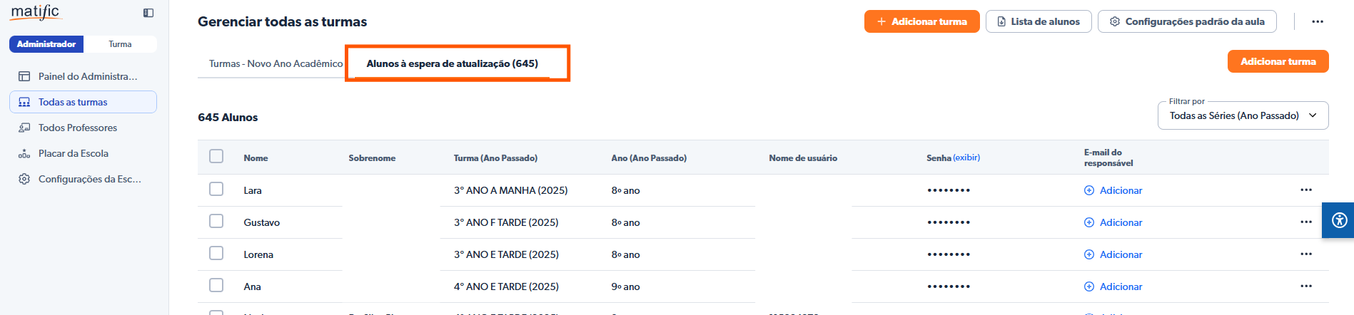 Por padrão, são exibidos todos os alunos que estavam em turmas de um ano/série abaixo do nível dessa nova turma.
