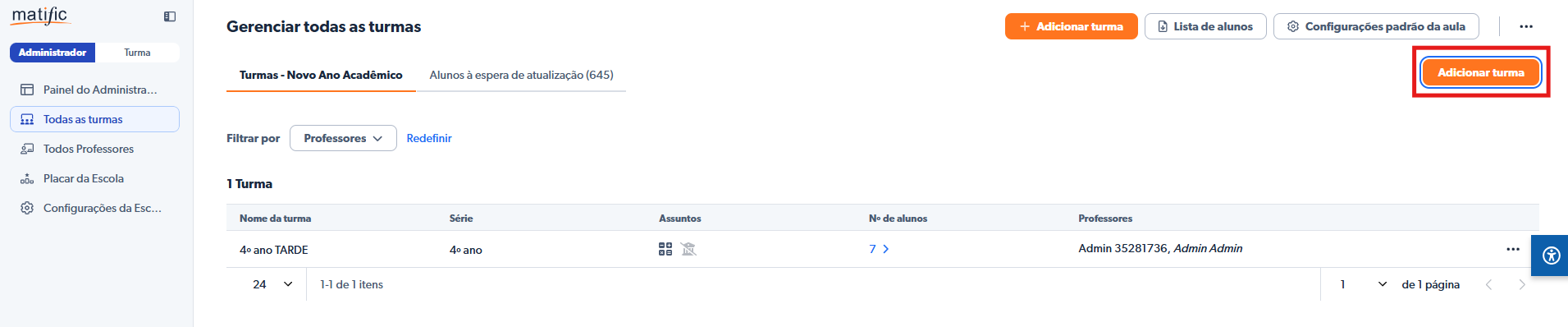 Clique em Todas as turmas no menu lateral e em seguida em Adicionar turma