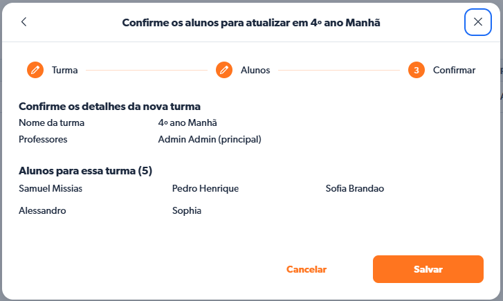 Verifique os detalhes da turma e os alunos selecionados, após confirmar que os dados e alunos estão corretos, clique em Salvar