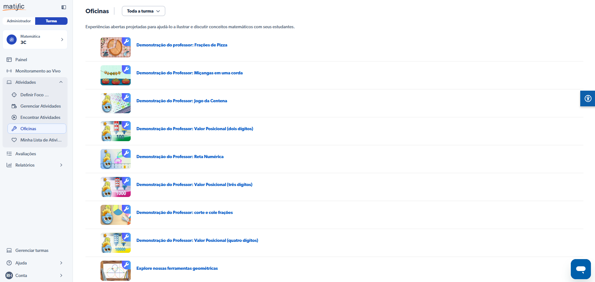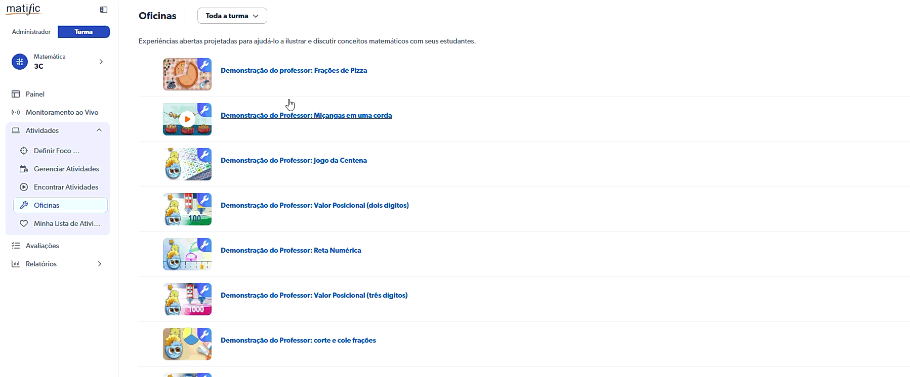💡 Você também pode acessar Atividades > Oficinas para visualizar todas as Oficinas disponíveis de Matemática.