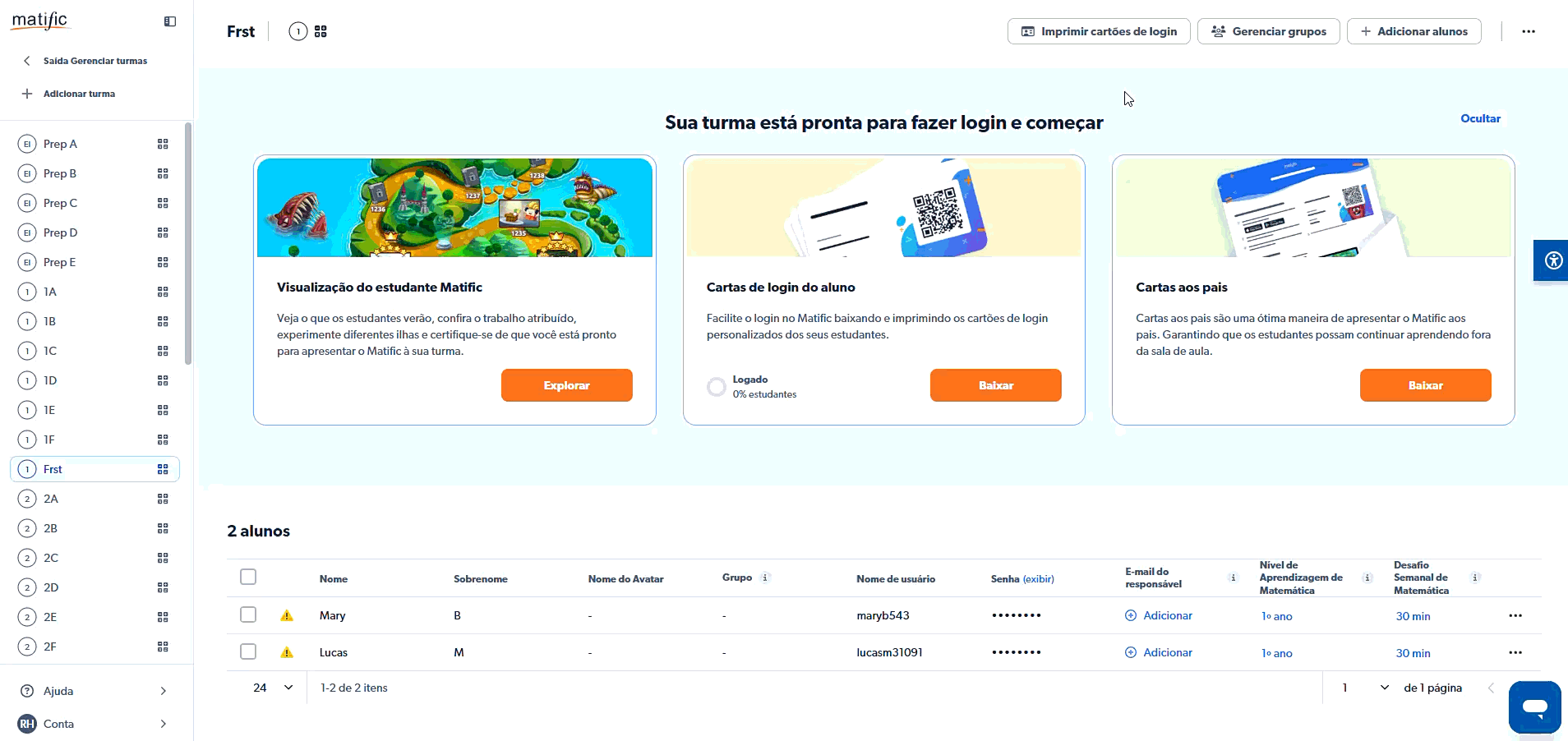 Depois que os alunos forem adicionados, você pode gerar rapidamente os dados de acesso para compartilhá-los.