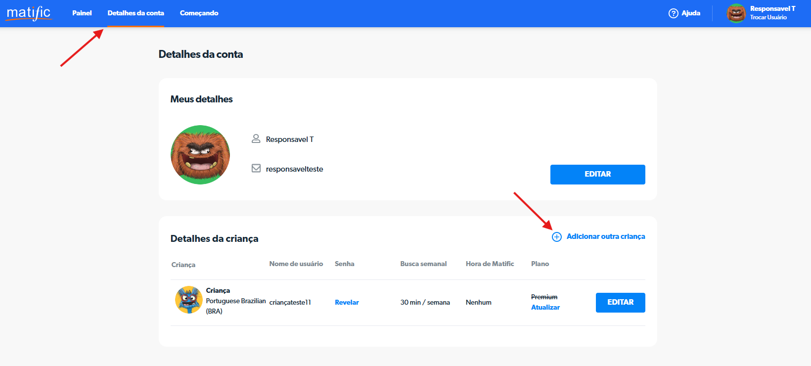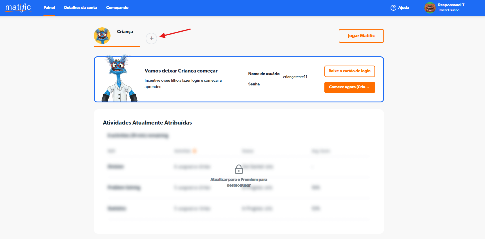 1. Painel do Responsável > Clique no ícone de adição ao lado da criança.