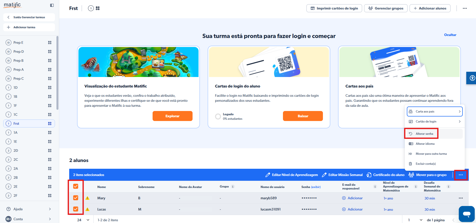 💡Você também pode alterar as senhas de vários alunos ao mesmo tempo selecionando múltiplos alunos, abrindo mais opções (...) e clicando em Alterar senha.
