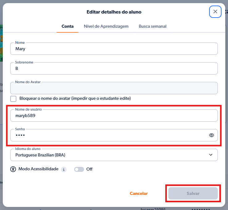 Como alterar o nome de usuário e a senha de um aluno