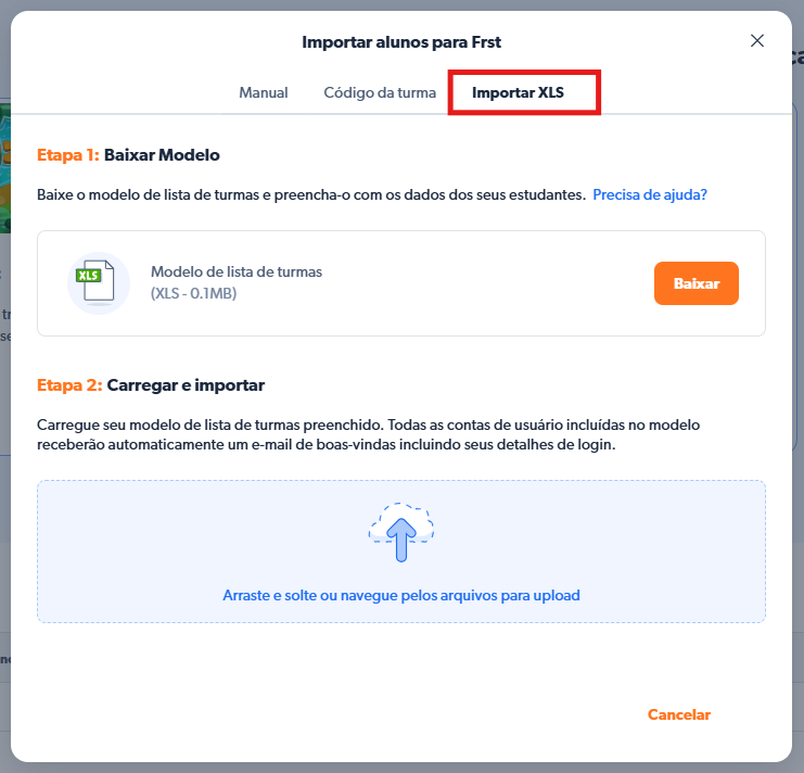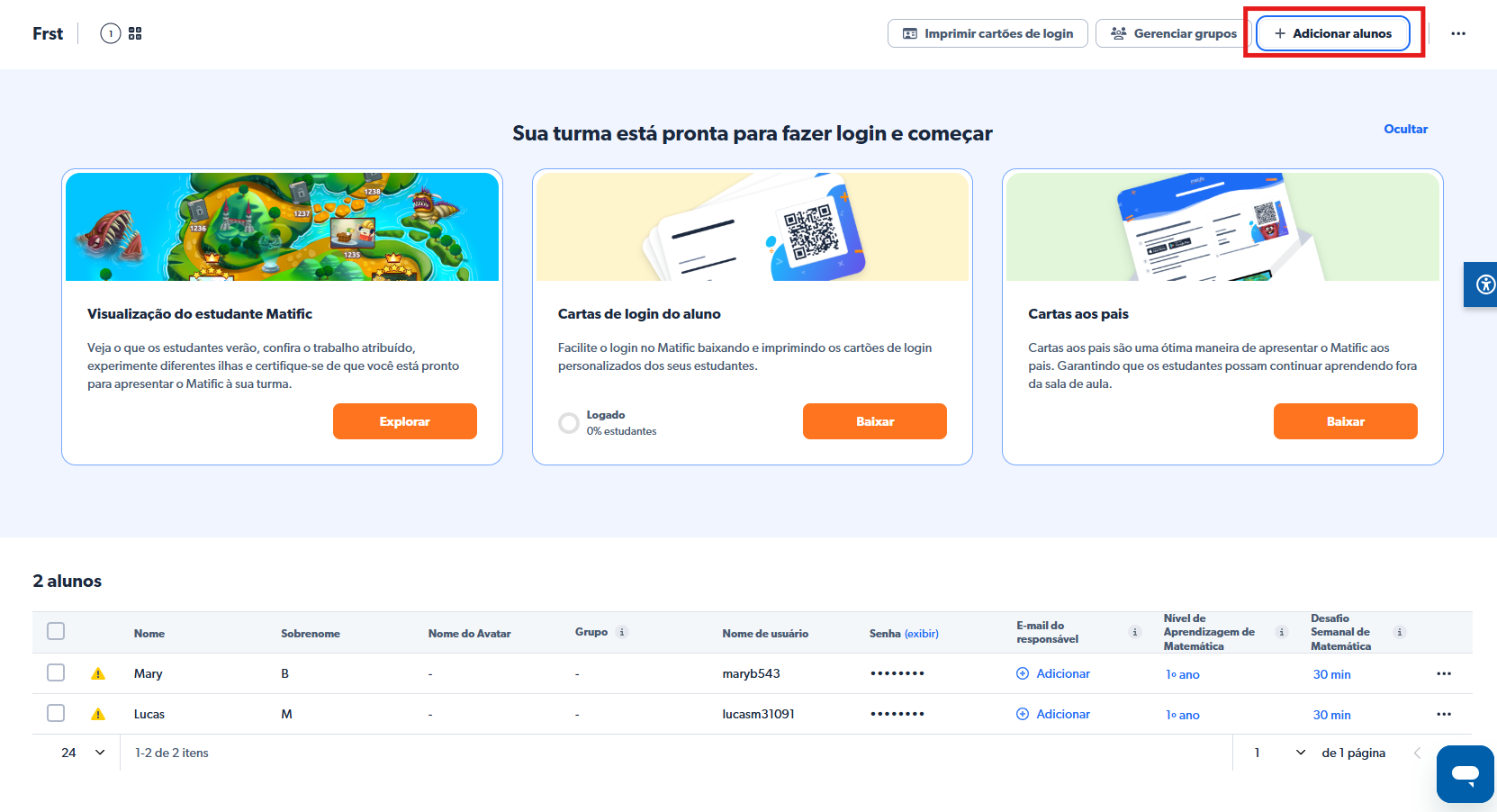Para adicionar alunos manualmente, siga os passos neste artigo.
