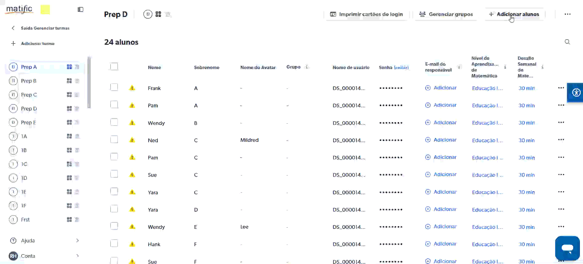 💡 Os nomes de usuário são gerados automaticamente quando os alunos são adicionados. Você pode alterá-los depois, se necessário.