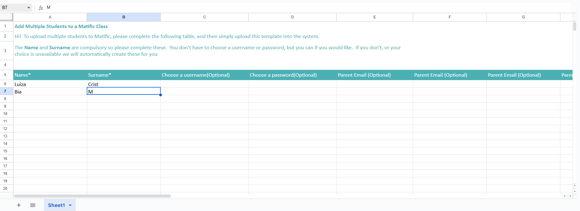 ❗O preenchimento do nome e do sobrenome dos alunos nesta planilha é obrigatório.