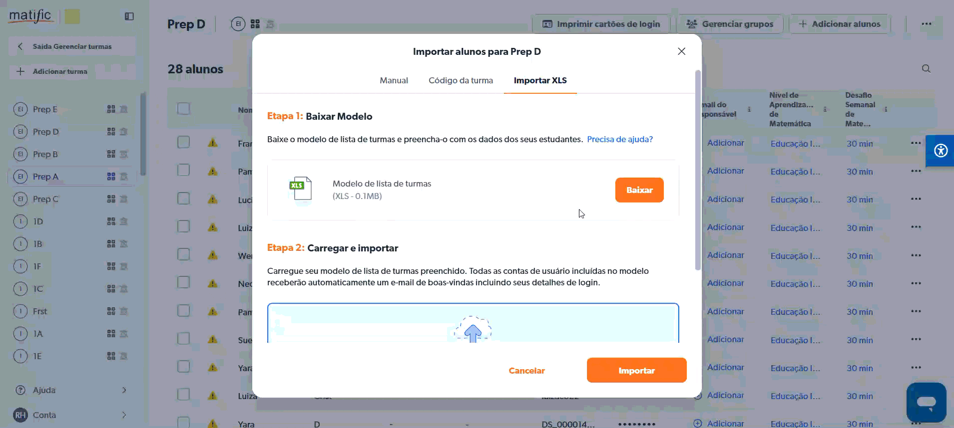 Preencha os dados dos alunos na planilha e envie o arquivo de volta na aba do passo 3 e clique em "Importar".