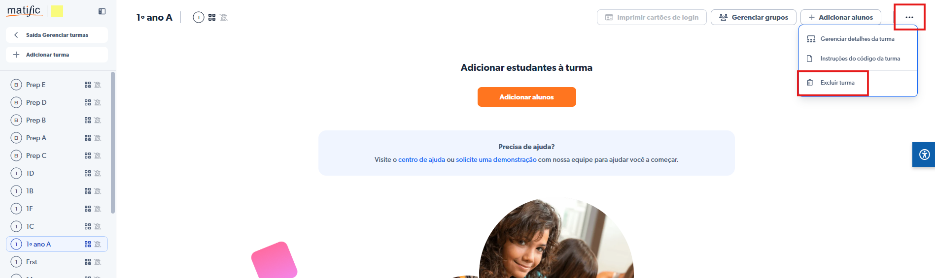 Observação: Sua escola pode restringir a exclusão de turmas. Nesse caso, entre em contato com o seu administrador da Matific na escola.
