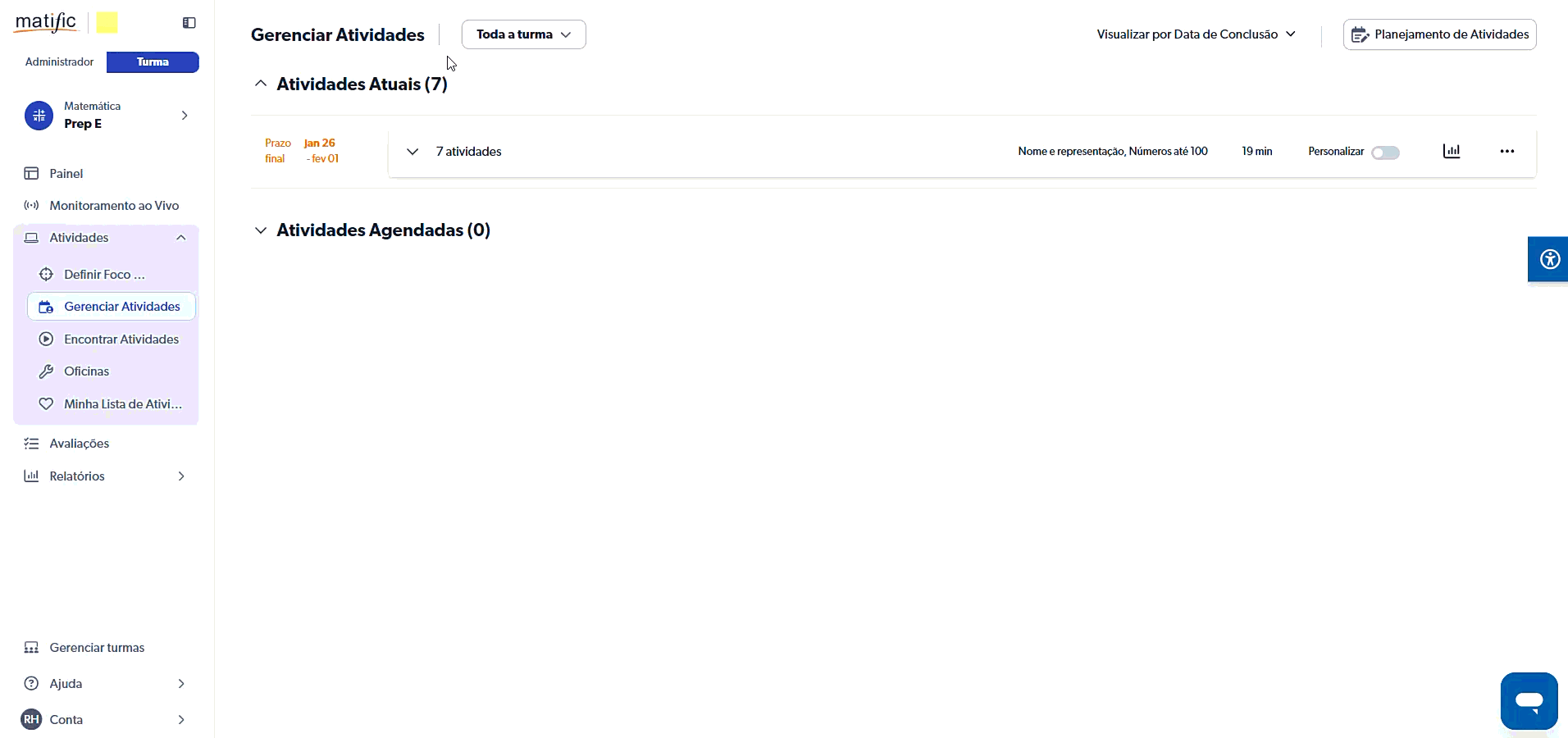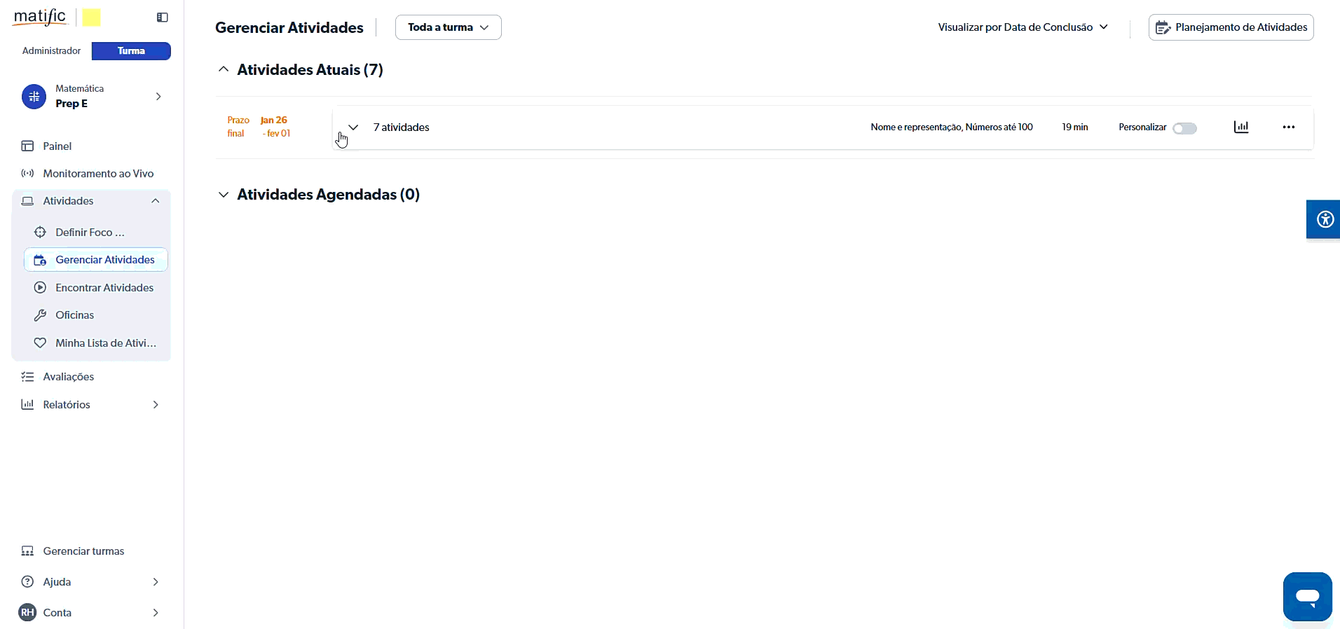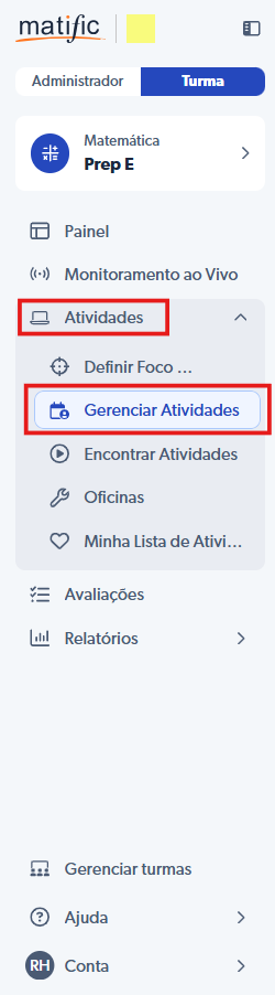 Para verificar as atividades atribuídas a seus alunos clique em Atividades >.Gerenciar atividades