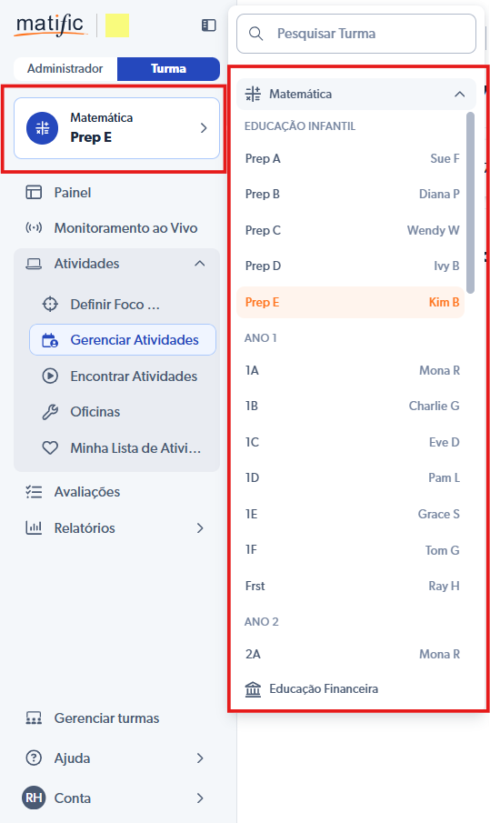 Selecione a turma que você deseja verificar as atividades atribuídas (Ex.: 1A).