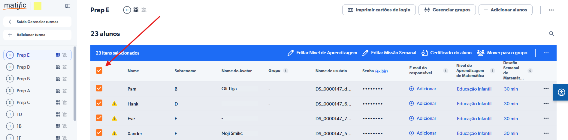 Selecione o aluno que quer imprimir as credenciais ou todos os alunos