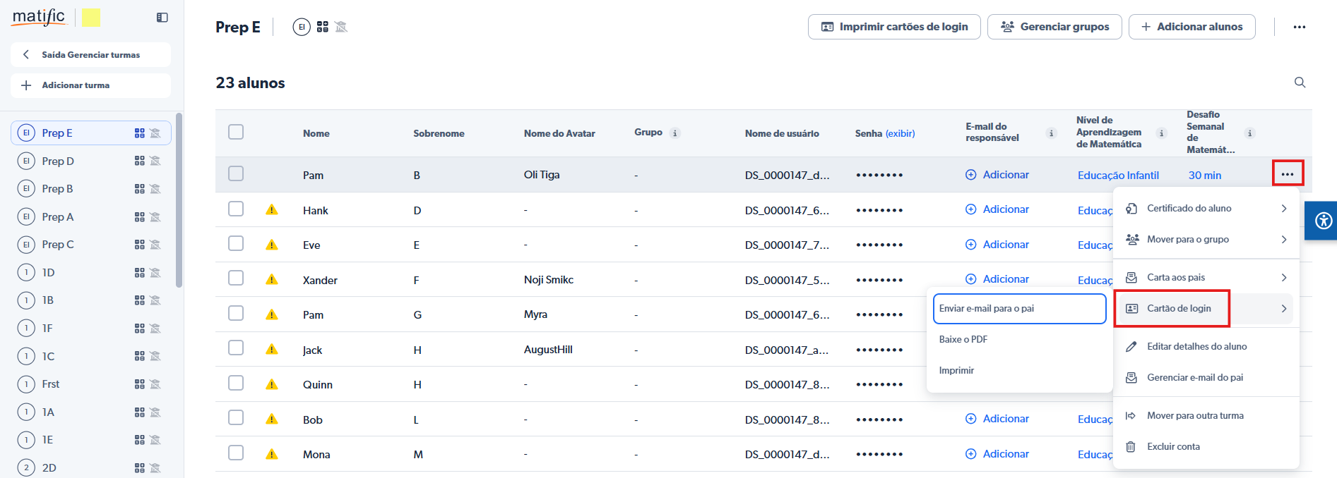 - Enviar e-mail para o pai: Envia os dados de cartão de login ao responsável via e-mail.