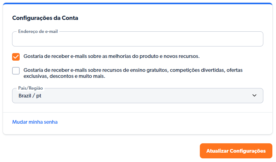 Observação: Alterar o idioma também alterará os currículos disponíveis nos quais as atividades estão organizadas. Veja o exemplo abaixo para mais detalhes.