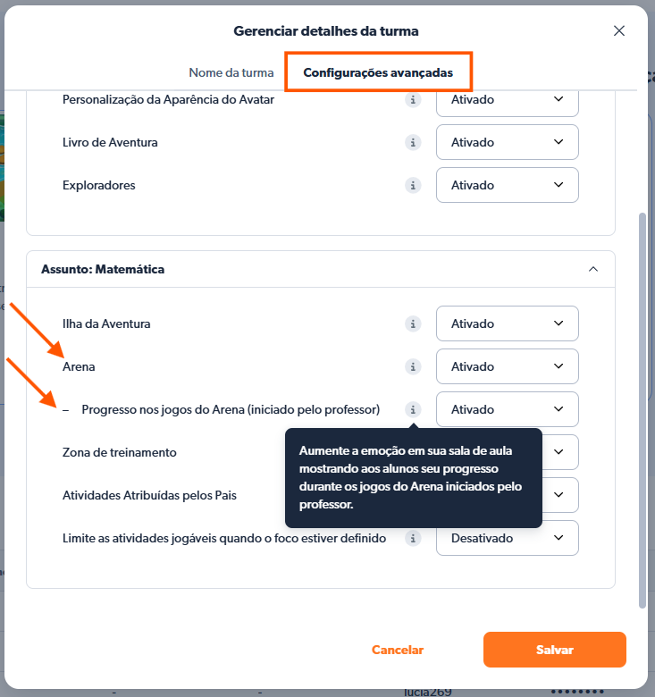 - Acesse Configurações Avançadas > Ativar/Desativar Progresso no Jogo da Arena (Iniciado pelo Professor) > Clique em Salvar.