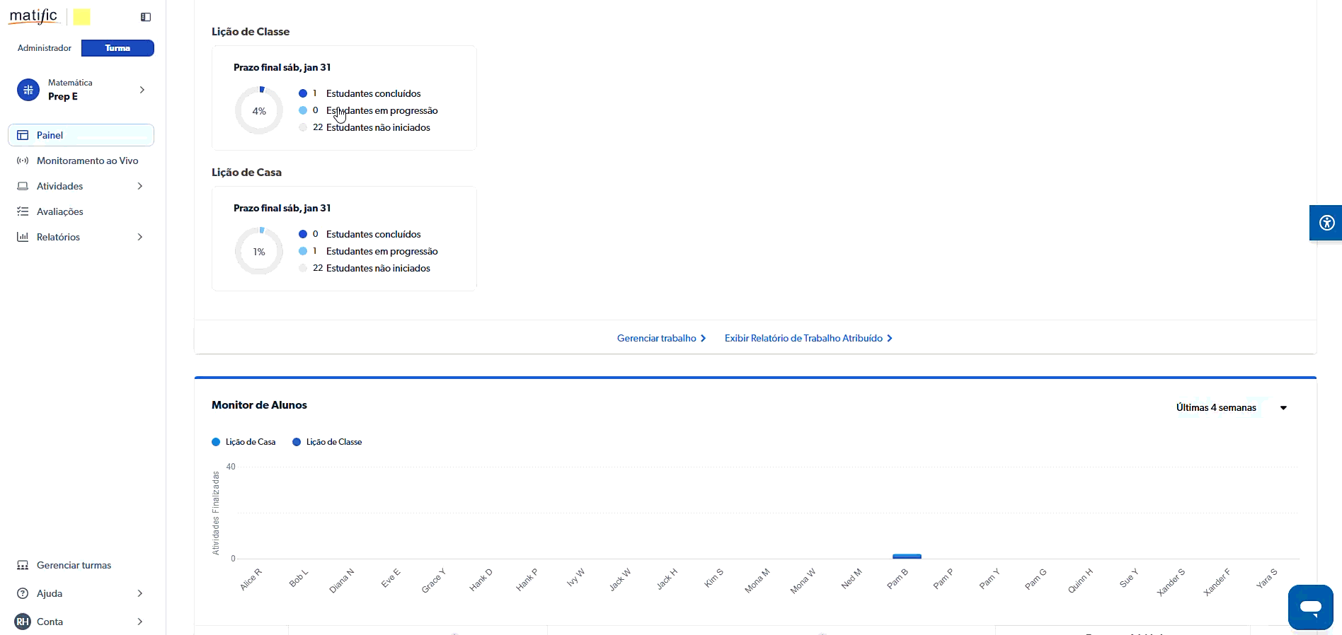 Cada cartão exibe informações essenciais, incluindo o número de alunos que concluíram, estão em andamento ou ainda não começaram a tarefa. As tarefas atrasadas são destacadas para que você possa motivar seus alunos a concluí-las.