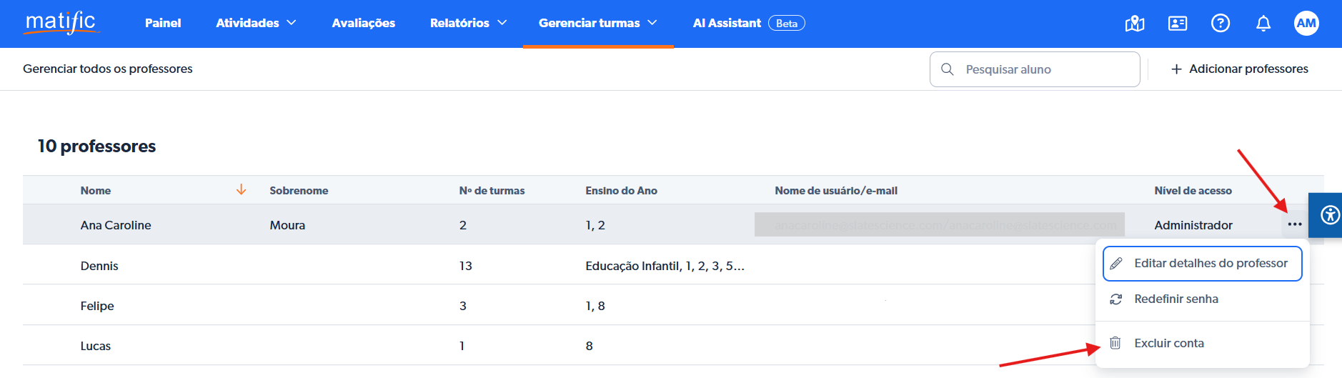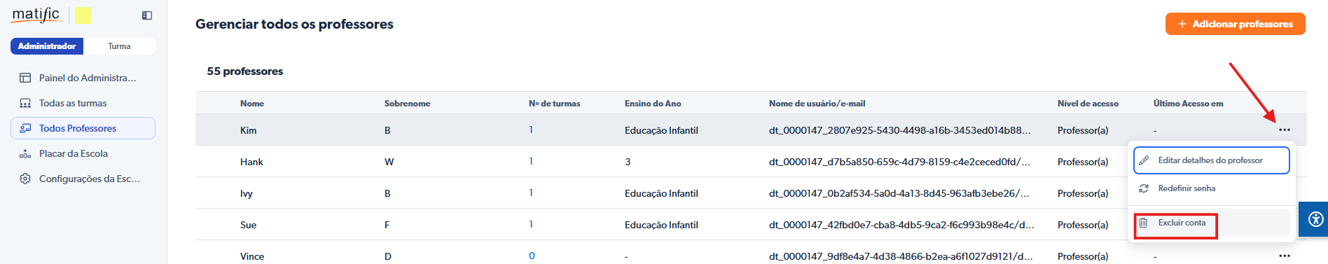 - Clique nos três pontinhos ao lado do professor que você deseja excluir > Excluir conta.