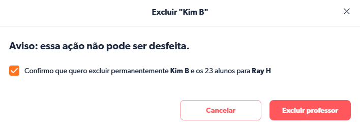 Observação: Qualquer turma em que o professor era o professor principal será transferida para o administrador que realizou a exclusão.