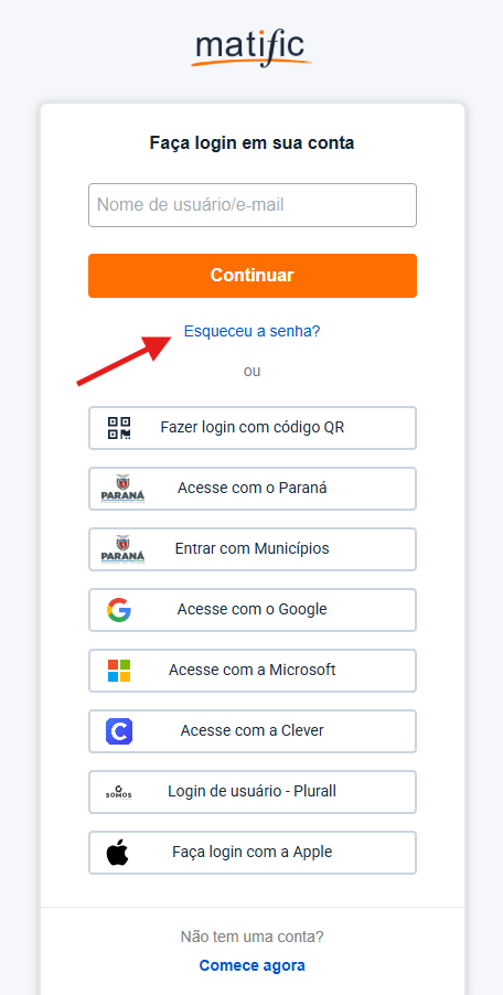 Se você acessa a Matific utilizando o botão facilitador do Google ou Microsoft, a redefinição de senha deve ser feita diretamente pela conta vinculada (Google ou Microsoft), conforme o domínio utilizado.