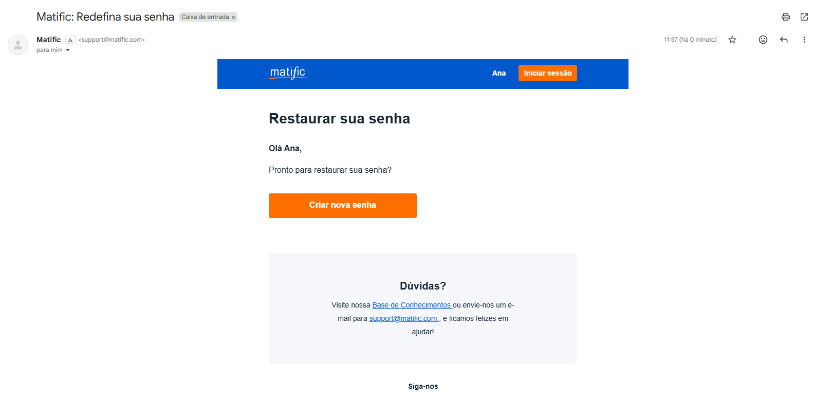 Se ainda encontrar qualquer dificuldade para acessar sua conta, nossa equipe de suporte está à disposição para ajudar, basta nos contatar em contato@matific.com
