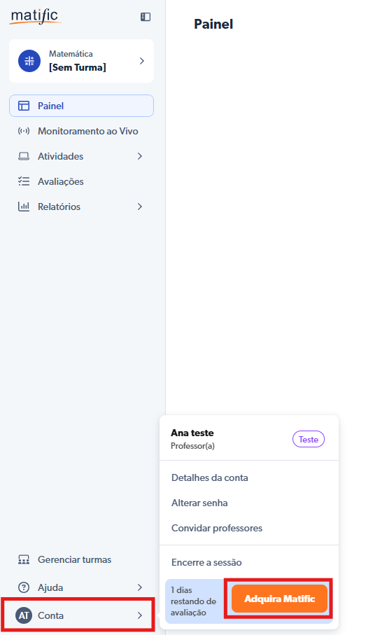 Se você gostaria de comprar uma licença, clique em Conta > Adquira Matific