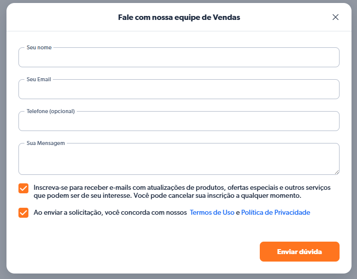 Digite seu nome, email e sua mensagem, depois clique em Enviar dúvida